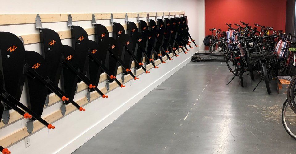 The idea behind the Wheelylift is very simple: hanging the bicycle vertically saves a lot of space. The Dutch inventor of the Wheelylift discovered that there was no convenient system for hanging bicycles weighing more than 10 kilos. He thought of a way to do that. The space savings that the vertical suspension of the bicycles yielded could be up to 60 percent. Wheelylift refined the product and made the storage system suitable for everyone.